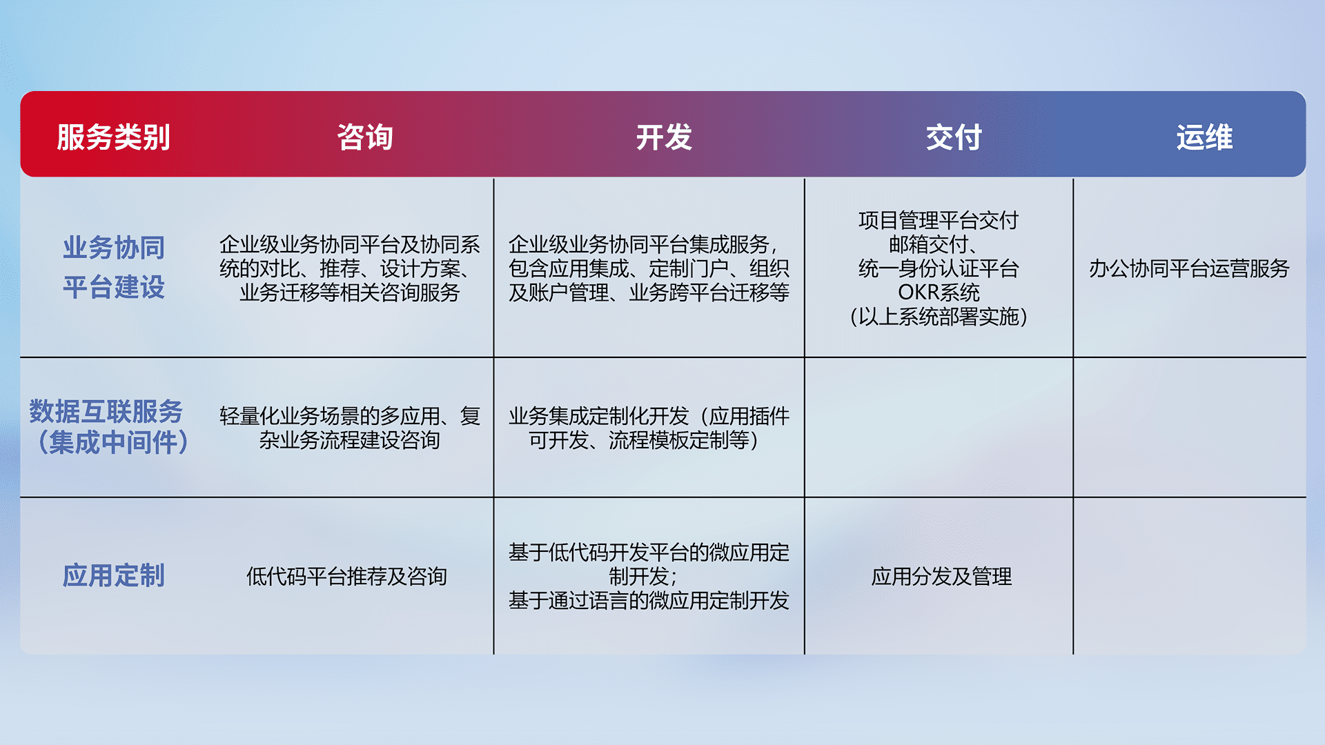 针对钉钉、、企微、、、IDaas等平台级产品提供产品的规划、、、、方案、、、、交付、、、定制化开发等服务,,实现如统一协同办公、、、智能客户服务、、混合会议管理、、智能数据查询、、、、等业务场景,,实现数字化转型。。